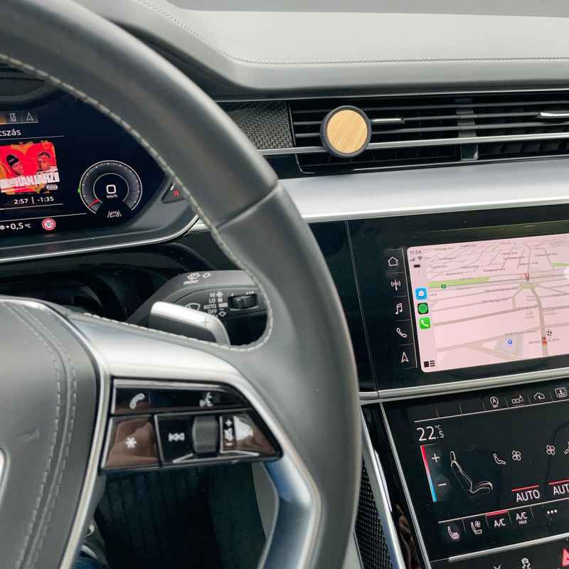 Mágneses, bambuszból készült autós mobiltartó, szellőzőre rögzíthető. Öntapadó fémlemezzel együtt, kraft papír dobozban szállítjuk.