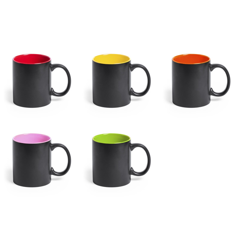 Fekete kerámia bögre, színes belső résszel, 350 ml. A gravírozott logó a bögre belsejével megegyező színű. Dobozban szállítjuk.