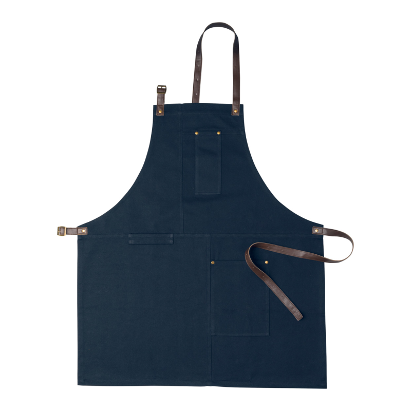 Pamut kötény elején zsebekkel és állítható műbőr pántokkal, 340 g/m².