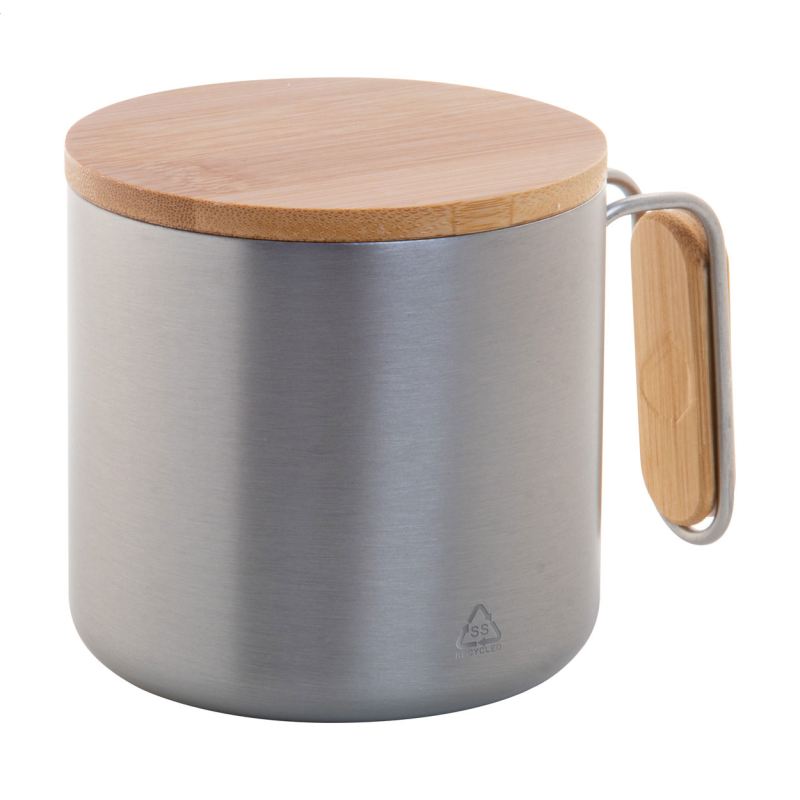 Duplafalú, újrahasznosított rozsdamentes acél thermo bögre bambusz fedéllel és fogganytyúval. 300 ml.