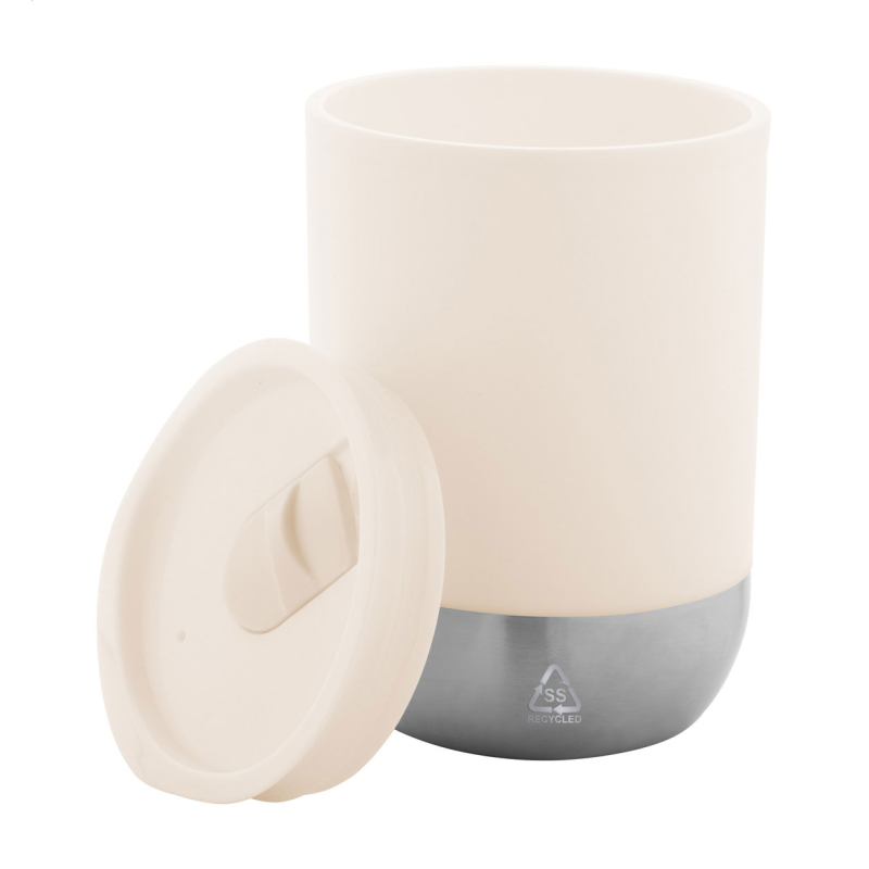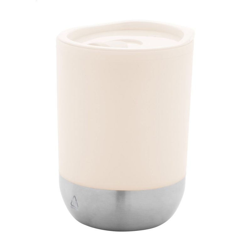 Duplafalú, PP műanyag szigetelésű thermo pohár újrahasznosított rozsdamentes acél talppal és ivófedéllel. 300 ml.