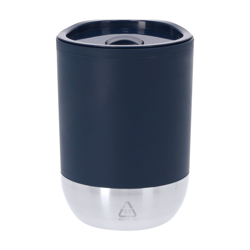 Duplafalú, újrahasznosított rozsdamentes acélból készült hőszigetelt thermo pohár, PP műanyag belsővel és ivófedéllel. 250 ml.