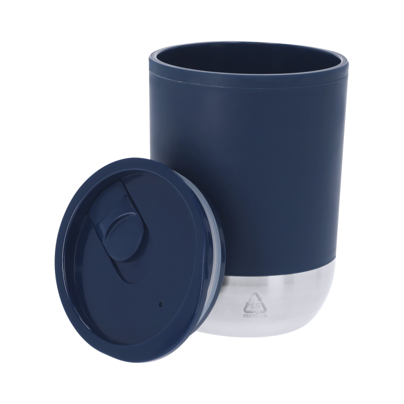 Duplafalú, PP műanyag szigetelésű thermo pohár újrahasznosított rozsdamentes acél talppal és ivófedéllel. 300 ml.
