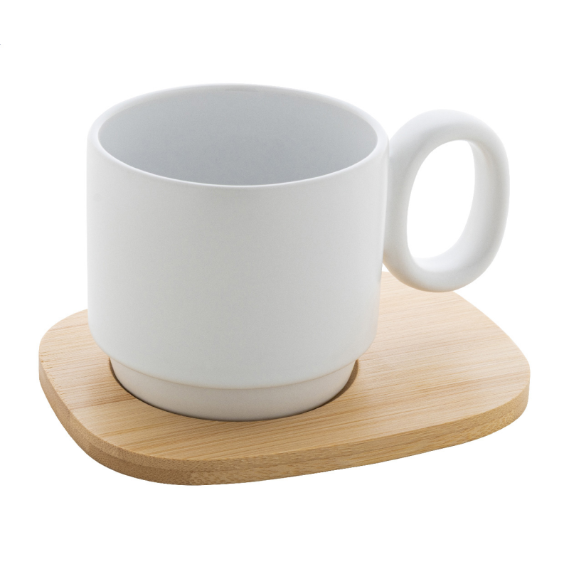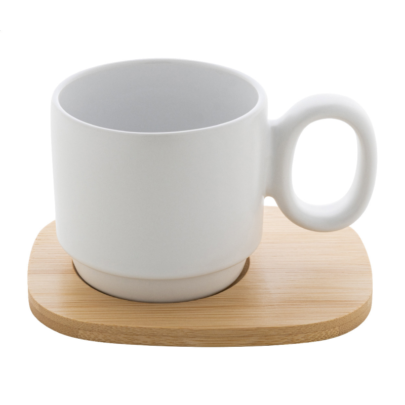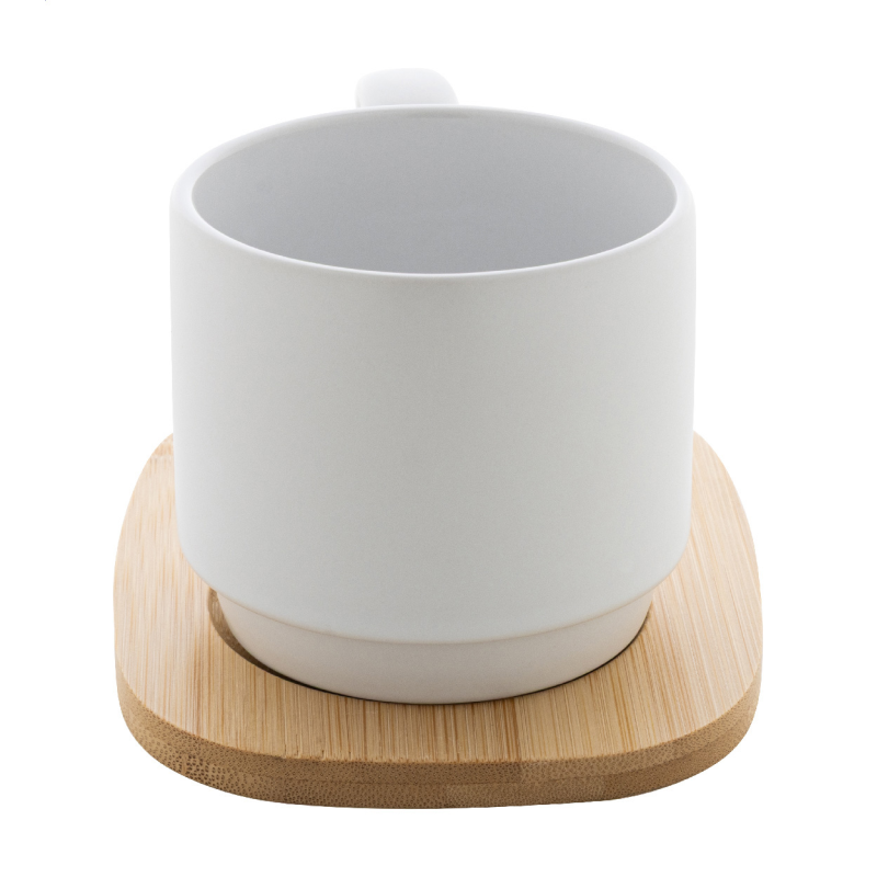 Kiváló minőségű kerámia bögre matt külső és fényes belső felülettel. Bambusz tálaló tálcával. 220 ml. Kraft papír dobozban.