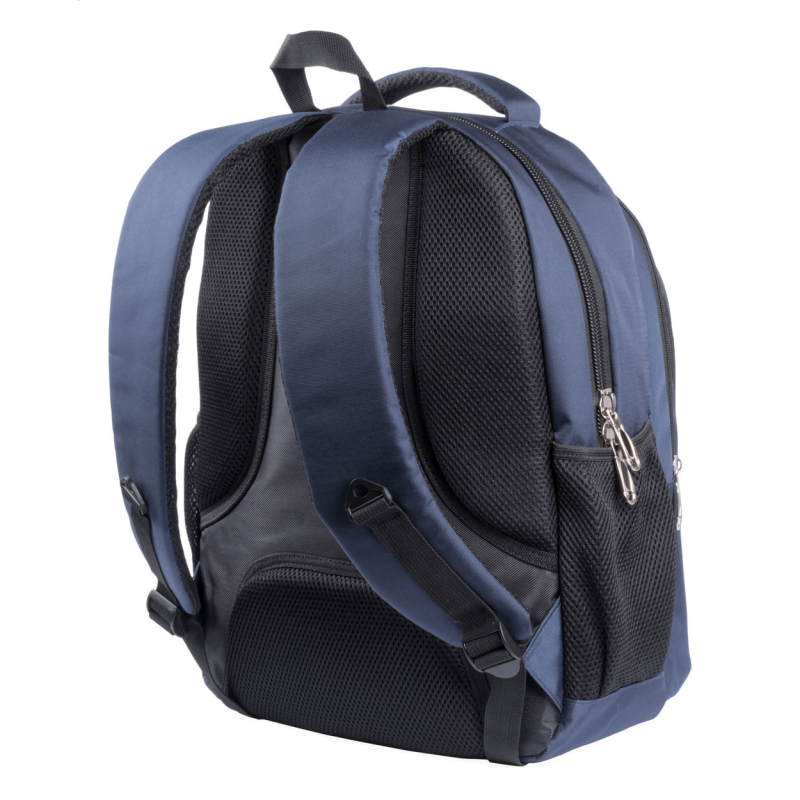 Hátizsák többféle cipzáras rekesszel, párnázott vállpántokkal, hátrésszel és laptoptartó rekesszel (15"). 600D nylon.
