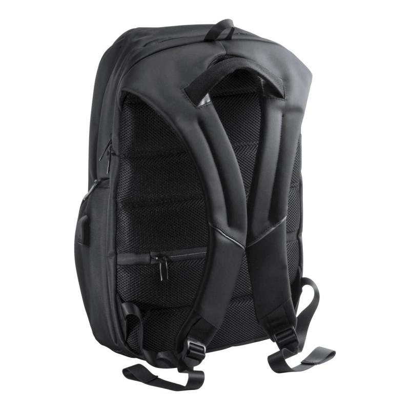 Vízálló, műbőr hatású hátizsák több cipzáras rekesszel, párnázott laptop résszel és vállpántokkal. Beépített USB csatlakozóval, a power bank-nak.