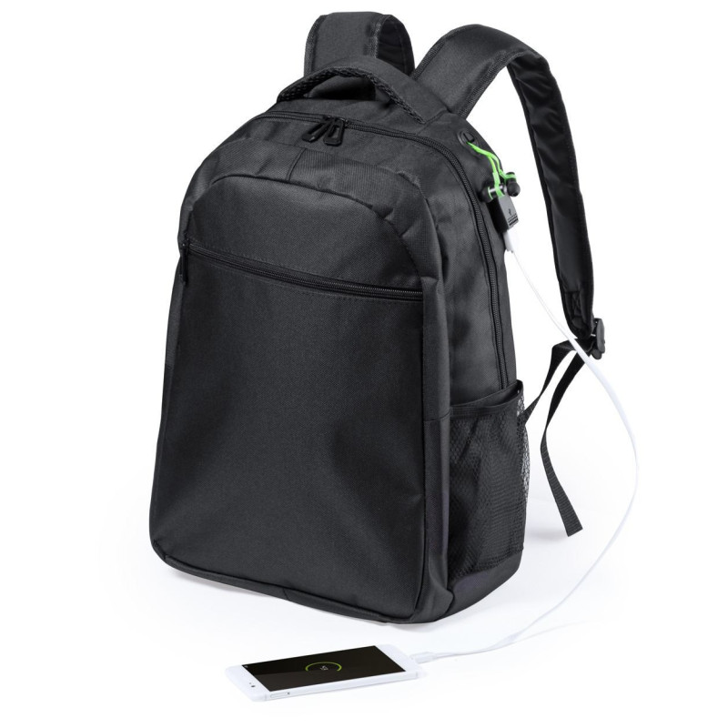 Vízálló, műbőr hatású hátizsák több cipzáras rekesszel, párnázott laptop résszel és vállpántokkal. Beépített USB csatlakozóval, a power bank-nak.