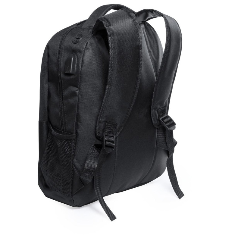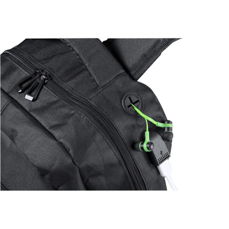 Vízálló hátizsák bélelt laptop (15") és tablettartó (10") résszel, fülhallgató kimenettel, beépített USB csatlakozóval power bankhoz (nem tartalmazza), hálós oldalzsebekkel és állítható vállpánttal.