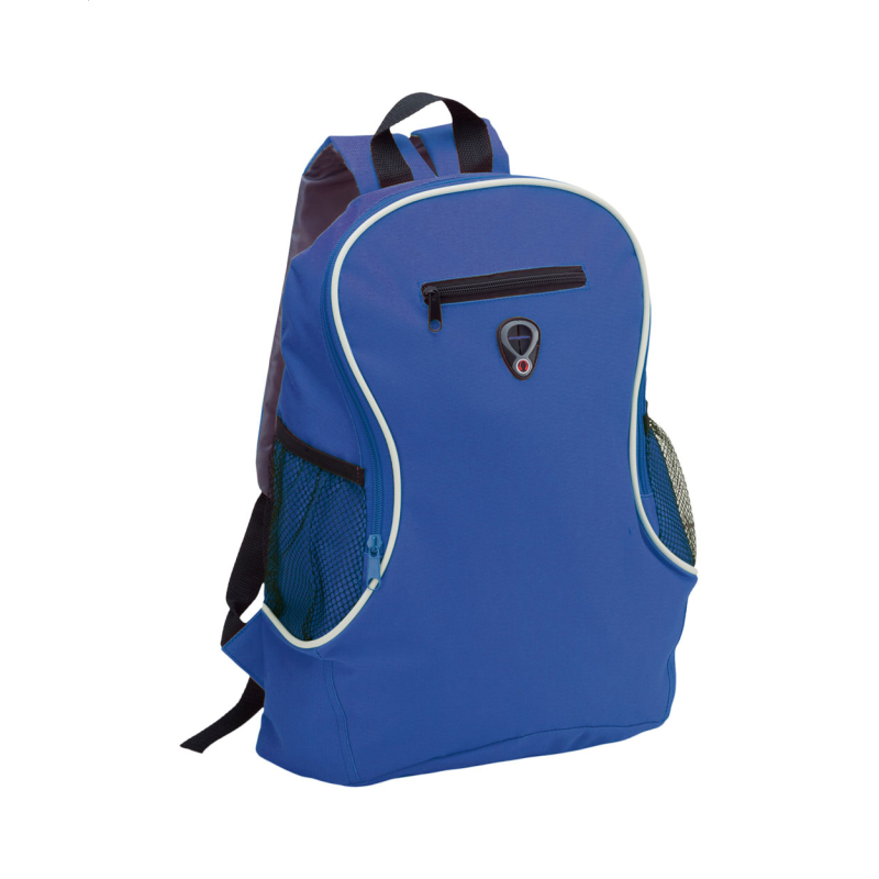 Hátizsák cipzáras elülső zsebbel, hálós oldalsó zsebbel, párnázott hátrésszel és vállpántokkal. 600D RPET poliészter. Megkülönböztető RPET címkével.