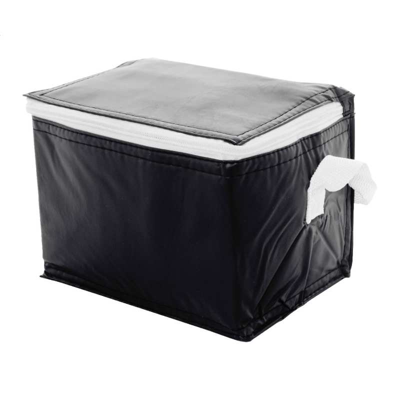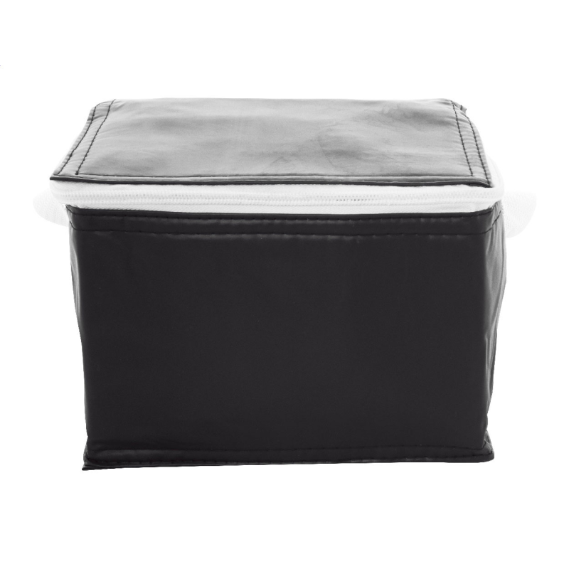 Cipzáras hűtőtáska alumínium béléssel 6 db 0,33l-es italdoboz részére. Anyaga: PVC.