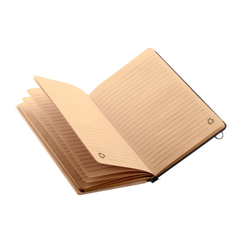 Parafa és műbőr borítású jegyzetfüzet 98 sima lappal, gumipánttal zárható. A5 méretű.