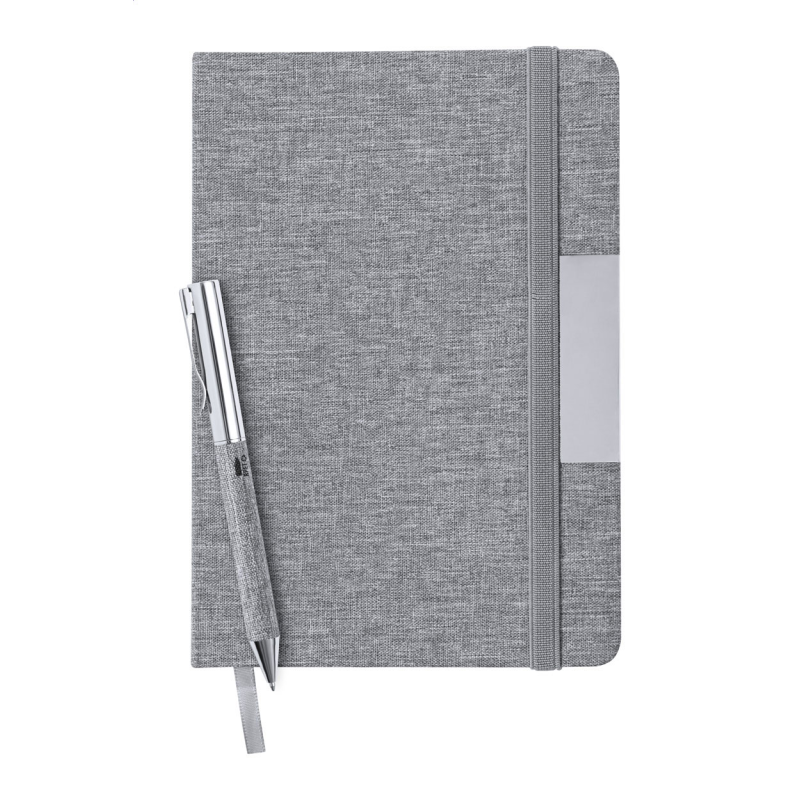 300D RPET poliészter borítású jegyzetfüzet 100 vonalas lappal és gumis pánttal. RPET poliészter borítású fém golyóstollal, kék tollbetéttel. A5 méretű.