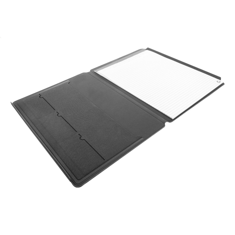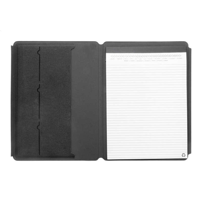 A5-es méretű, újrahasznosított PU bőr iratmappa belső rendezőzsebekkel és mágneses zárással.