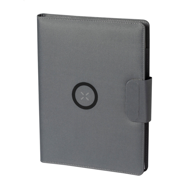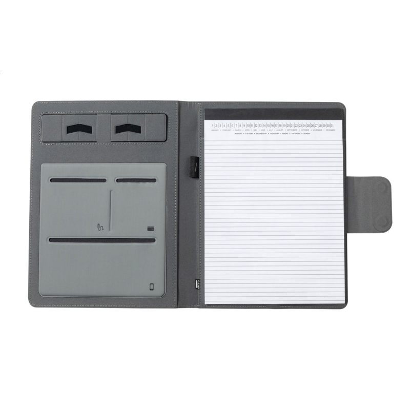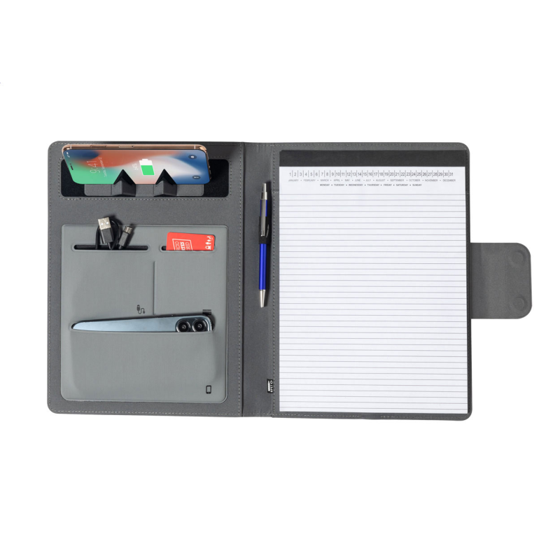 A4 méretű, 300D RPET poliészterből készült iratmappa. Beépített, mágneses vezeték nélküli töltővel (10W), 5000 mAh akkumulátorú power bank-kal és USB bemenettel ellátva.