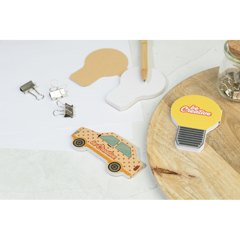Egyedi gyártású, autó alakú öntapadós jegyzettömb újrahasznosított kraft papír borítással.