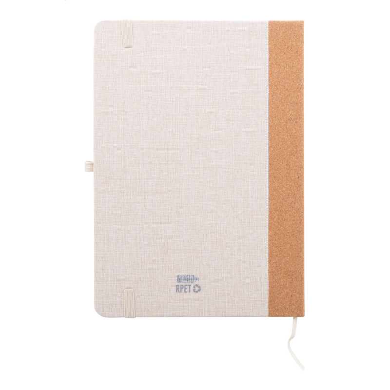 RPET poliészter borítású jegyzetfüzet natúr parafa gerinccel és 80 vonalas lappal, újrahasznosított papírból.