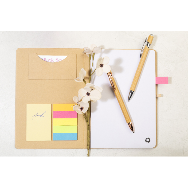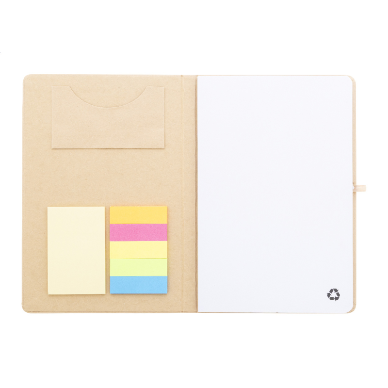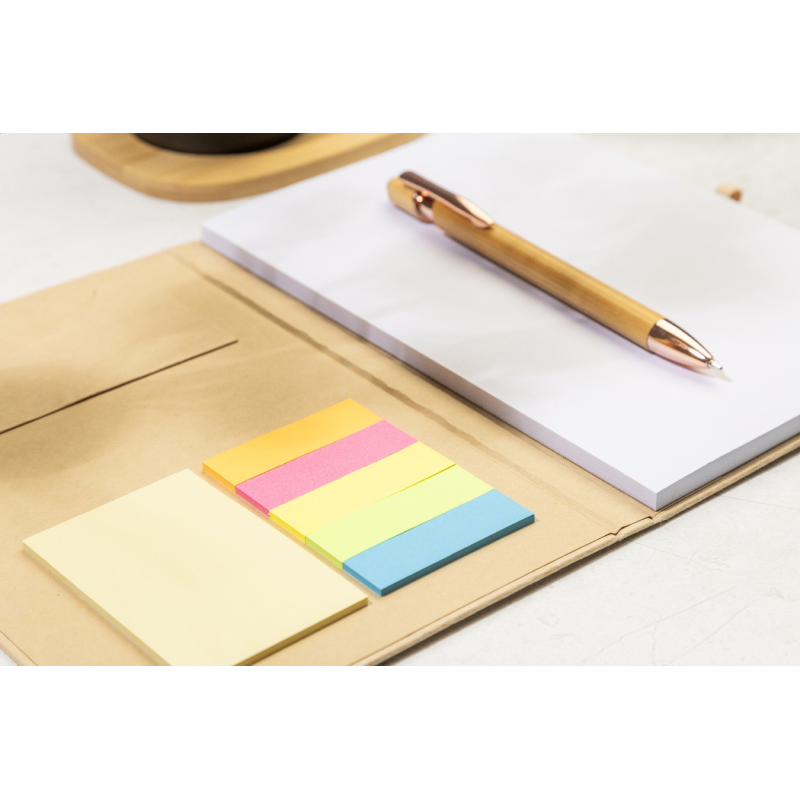 A belső borító 25 öntapadós jegyzetpapírt, 125 oldaljelölőt és egy kártyatartó zsebet tartalmaz.