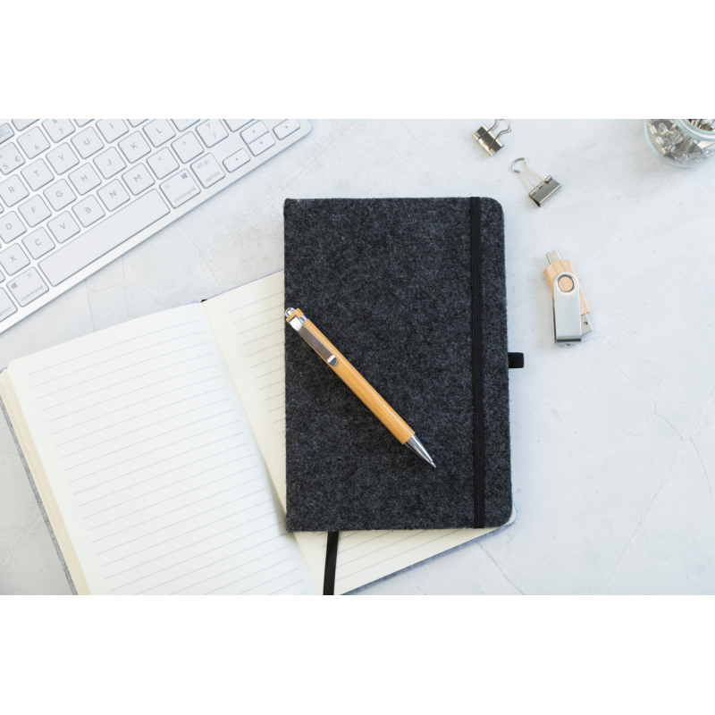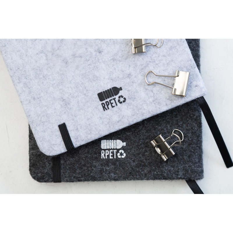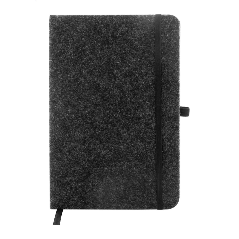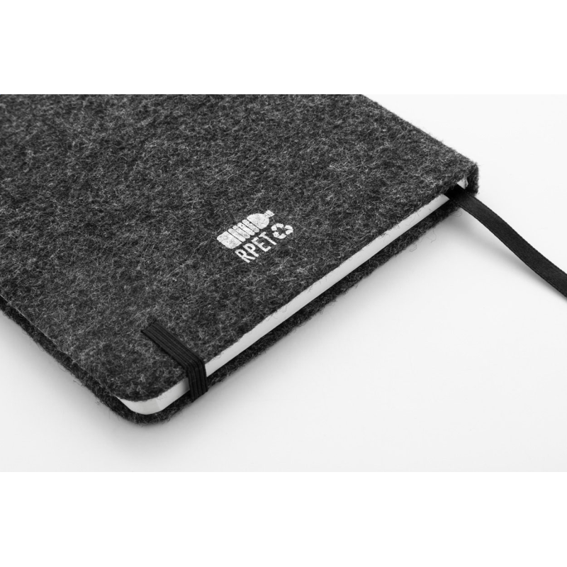 RPET filc borítású jegyzetfüzet 80 vonalas lappal, újrahasznosított papírból. Könyvjelzővel, gumipánttal és tolltartóval. A5 méretű.