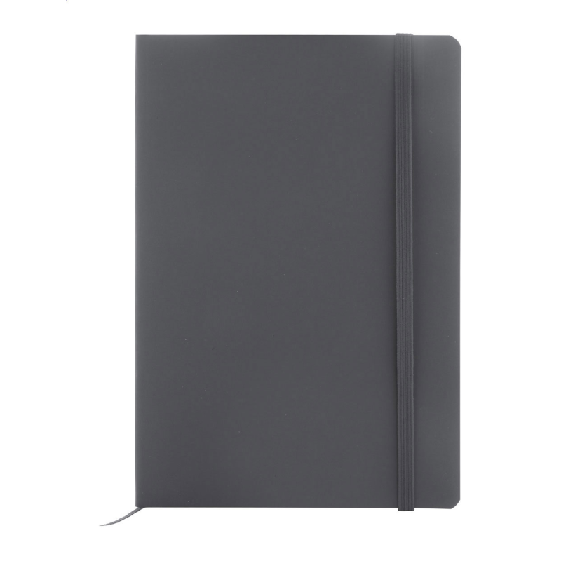 Műbőr borítású 100 oldalas jegyzetfüzet, vonalas lapokkal, gumipánttal zárható.