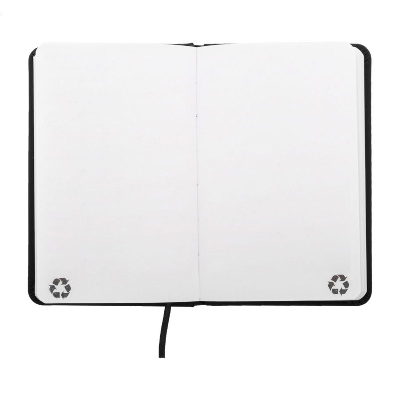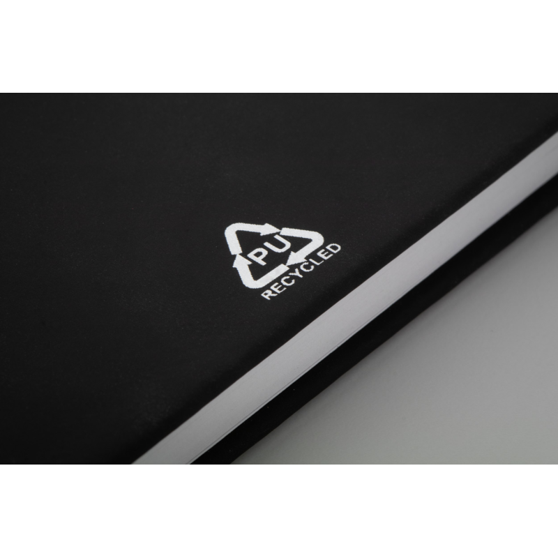 Újrahasznosított PU műbőrrel borított jegyzetfüzet 70 vonalas lappal újrahasznosított papírból és 125 oldaljelölővel (5 különböző színben).