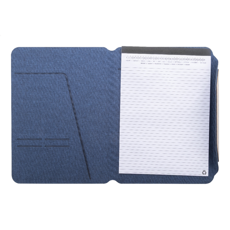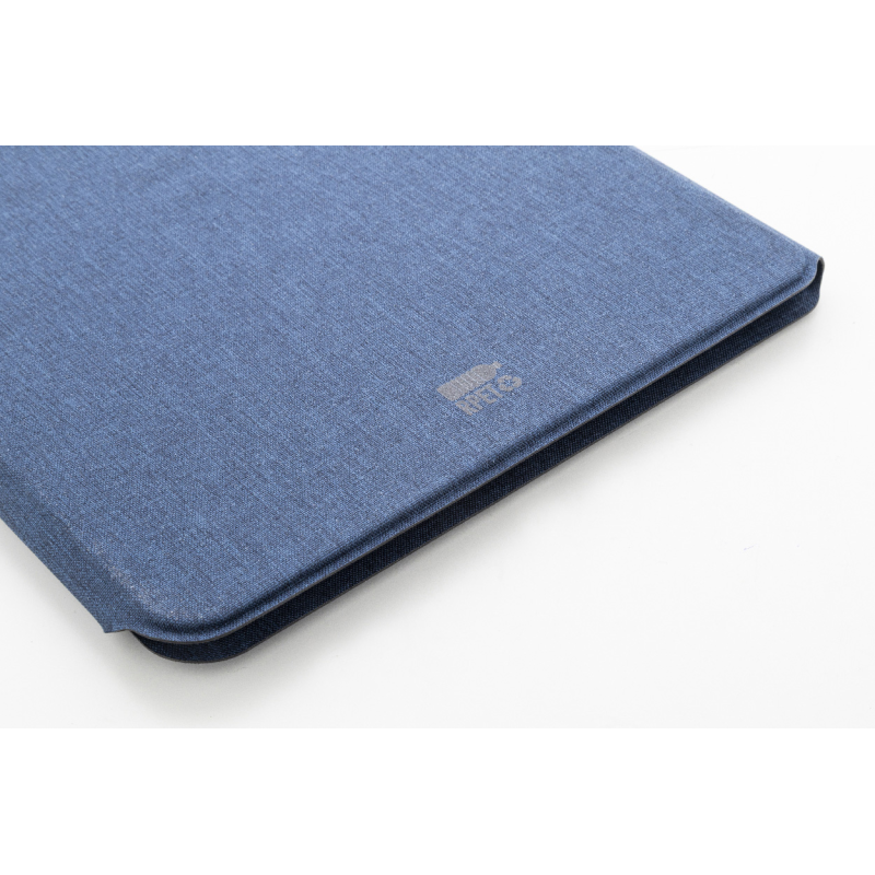 RPET poliészter borítású jegyzetfüzet bambusz betéttel, mobiltartó funkcióval és beépített vezeték nélküli gyors töltővel (15W).
