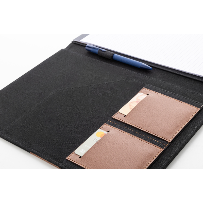 Vászon és műbőr borítású A4-es cipzáras iratmappa hordfüllel, 20 lapos jegyzettömbbel, napelemes számológéppel. Borítón jól emblémázható fém lemez található.
