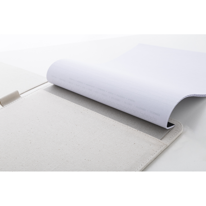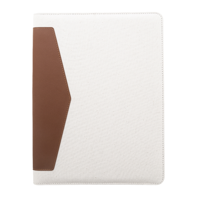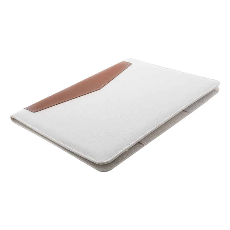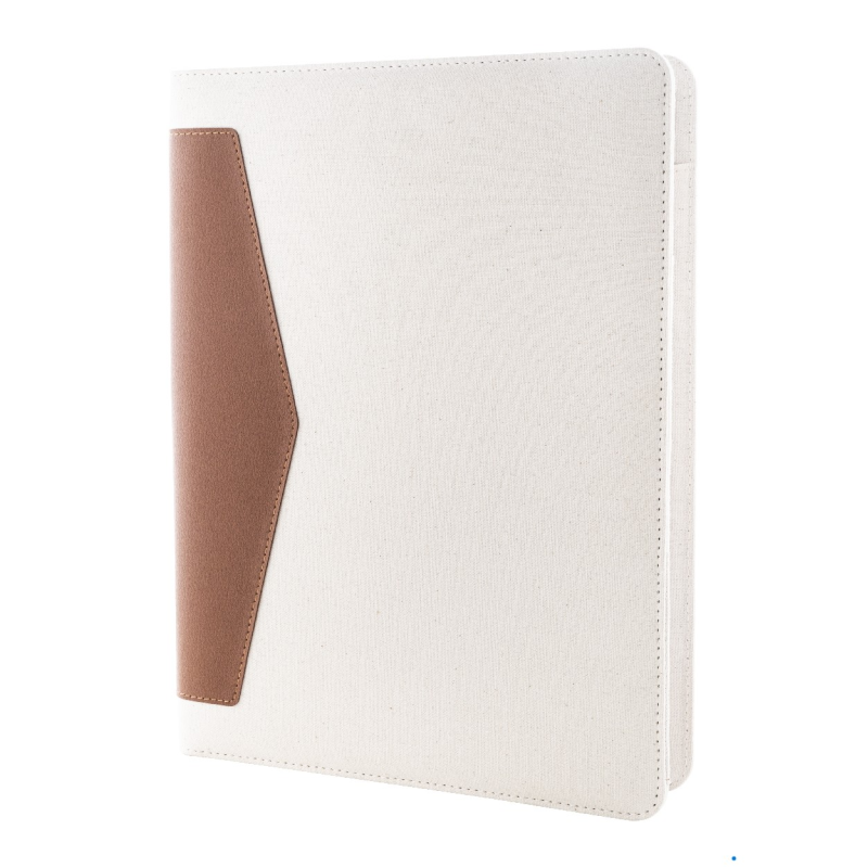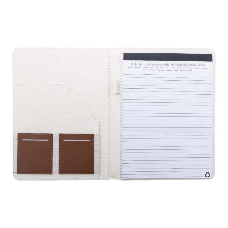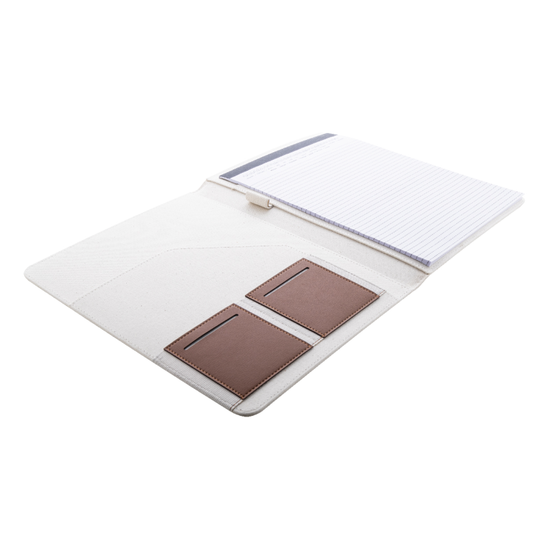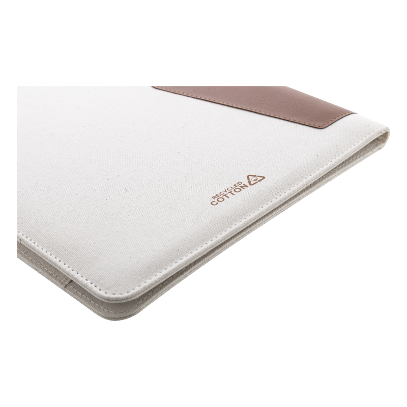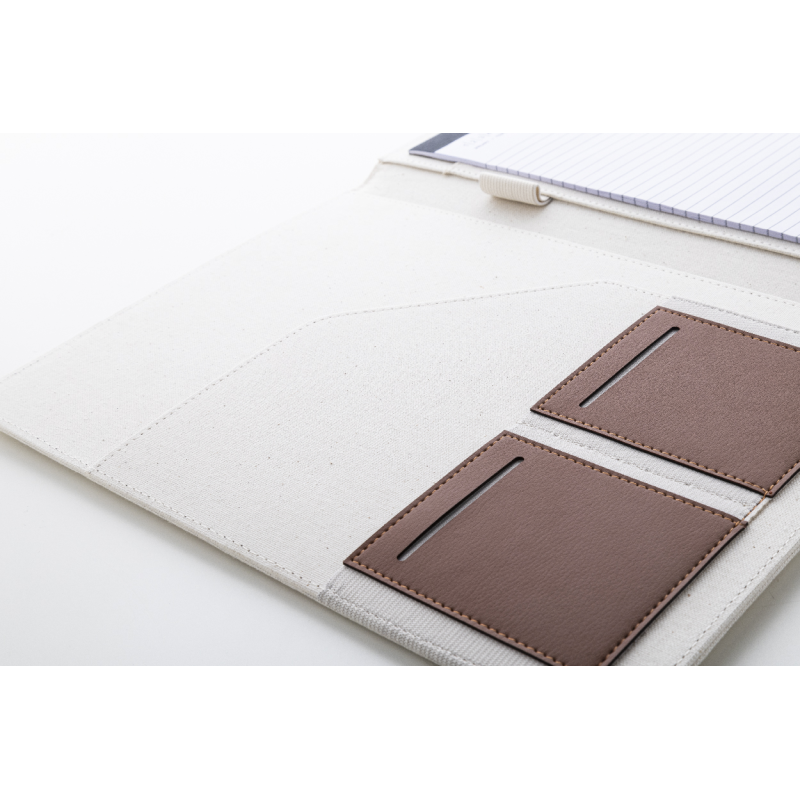 A4-es méretű, újrahasznosított vászon és újrahasznosított PU bőr iratmappa több belső rendezőzsebbel.