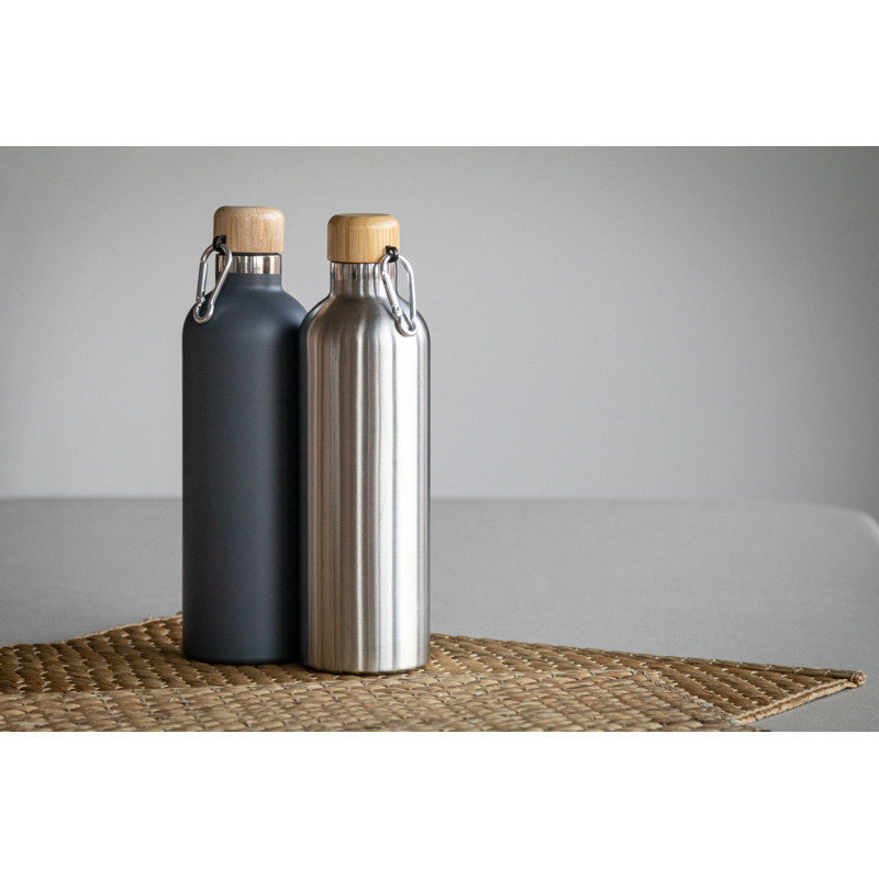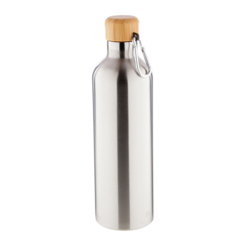 Duplafalú, rozsdamentes acélból készült termosz bambusz kupakkal és karabinerrel, 500 ml.