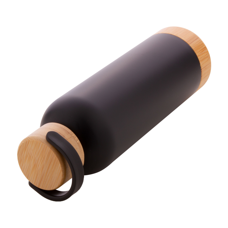 Rozsdamentes acélból készült duplafalú termosz, bambusz hordozható fedéllel és talppal, 500 ml.