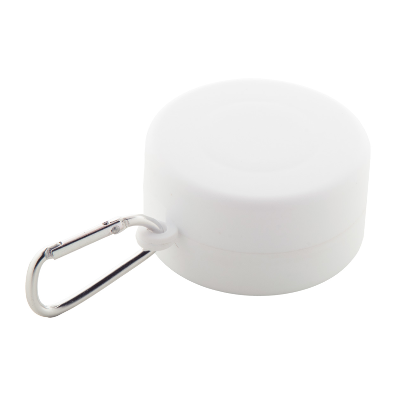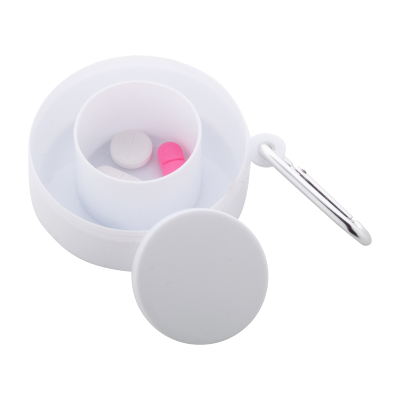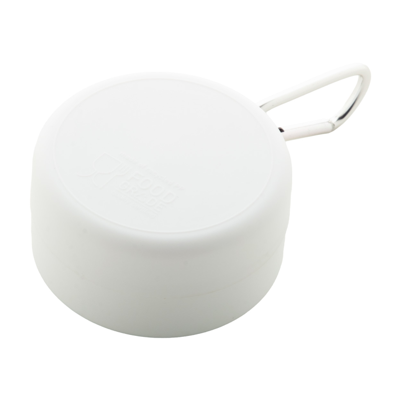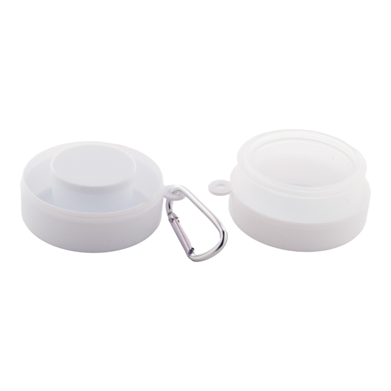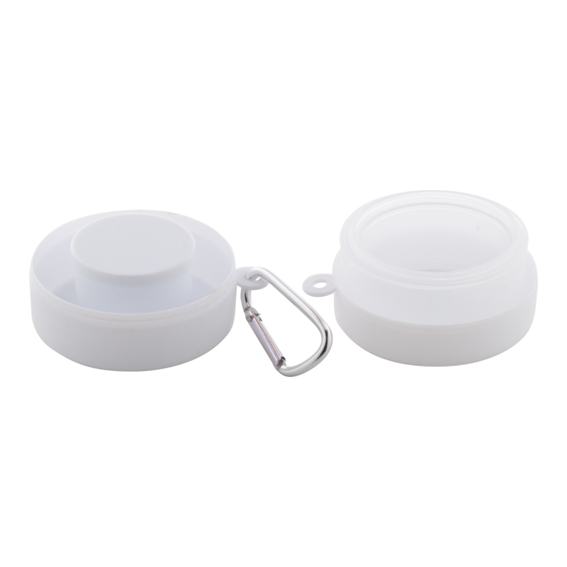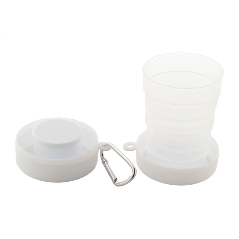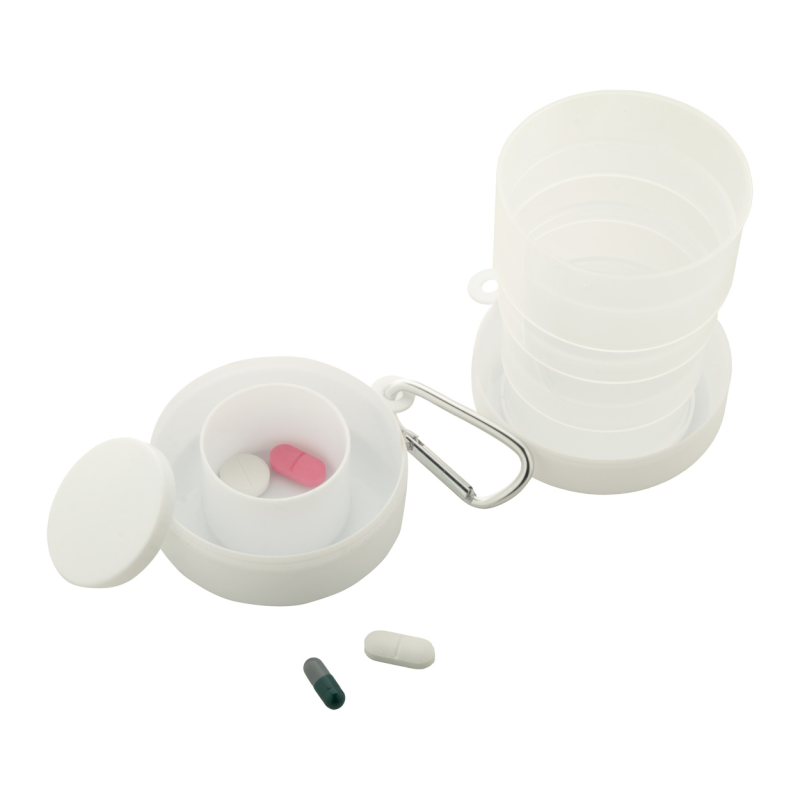 Újrahasznosított PP műanyagból készült összecsukható pohár gyógyszertároló rekesszel és fém karabinerrel. 220 ml. BPA mentes.