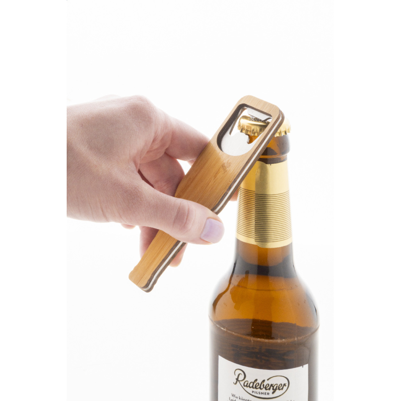 Üveg alakú, rozsdamentes acél üvegnyitó bambusz felülettel.