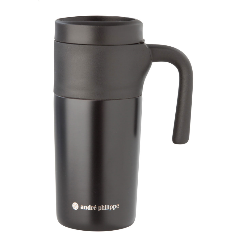 Rozsdamentes acélból készült termo bögre műanyag fogóval és ivónyílással a tetején, 330 ml. Fekete karton díszdobozban szállítjuk. André Philippe márkatermék.