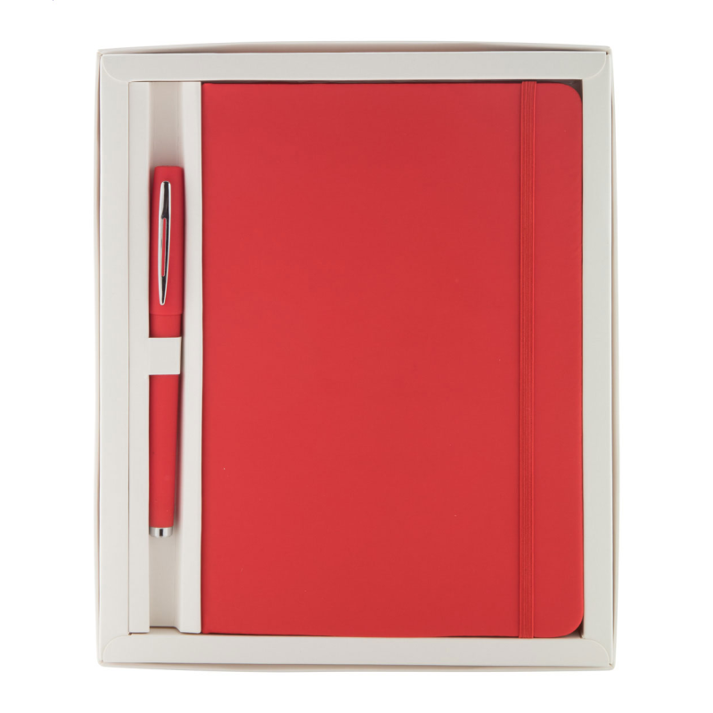 Jegyzet szett, mely tartalmaz 1 db 100 oldalas műbőr borítású jegyzetfüzetet és egy színével megegyező golyóstollat. Fehér díszdobozban szállítjuk.