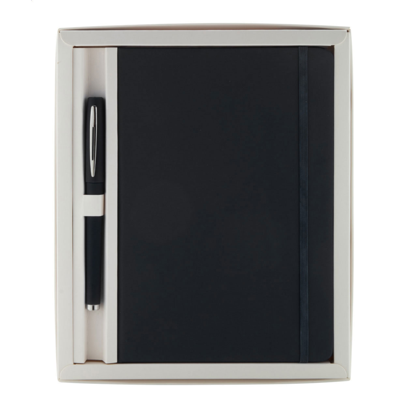 Jegyzet szett, mely tartalmaz 1 db 100 oldalas műbőr borítású jegyzetfüzetet és egy színével megegyező golyóstollat. Fehér díszdobozban szállítjuk.