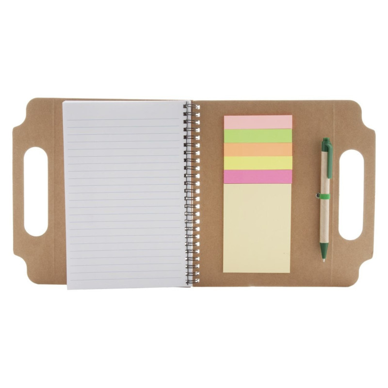 Újrahasznosított kartonból készült spirálos notesz 70 lappal, kék tollbetétes golyóstollal és jegyzetjelölő csíkkal (125 db nagy és 25 db kicsi).