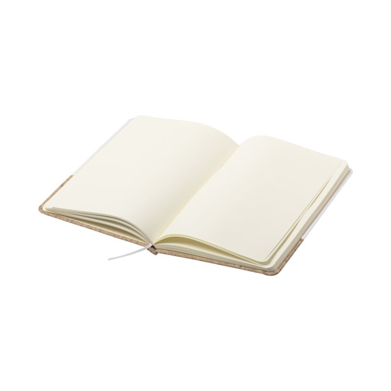 RPET filc és természetes parafa borítású jegyzetfüzet újrahasznosított papírból készült 80 vonalas lappal, gumipánttal, könyvjelzővel és tolltartóval. A5 méretű.