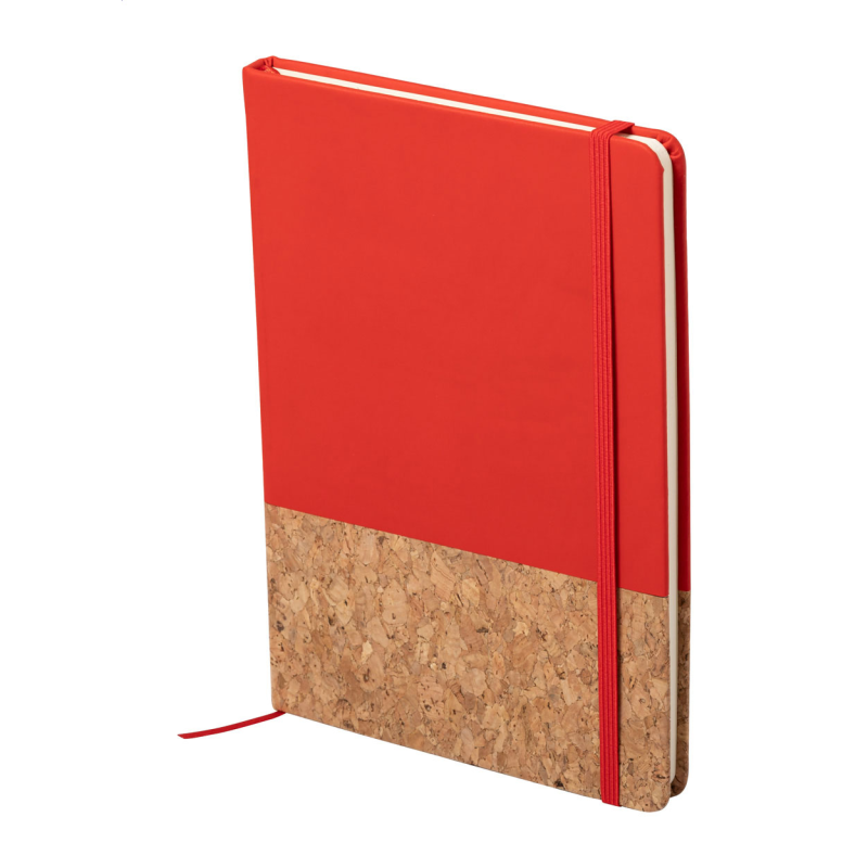 RPET filc és természetes parafa borítású jegyzetfüzet újrahasznosított papírból készült 70 vonalas lappal, gumipánttal és tolltartóval. A5 méretű.