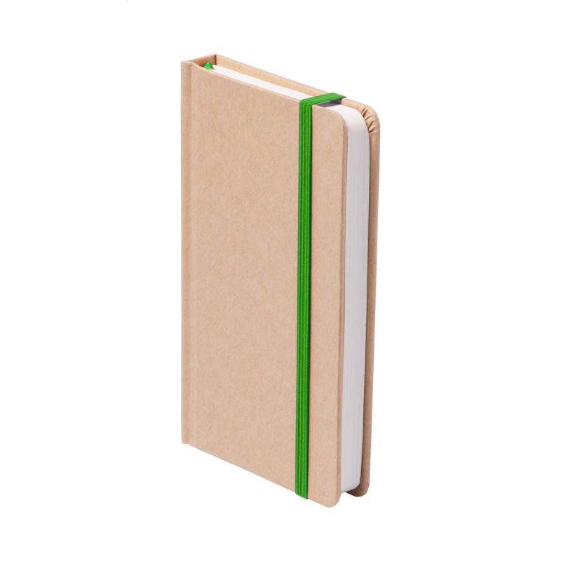 Újrahasznosítható anyagból készült karton borítású, 60 lapos jegyzetfüzet, csíkos lapokkal, gumipánttal zárható.