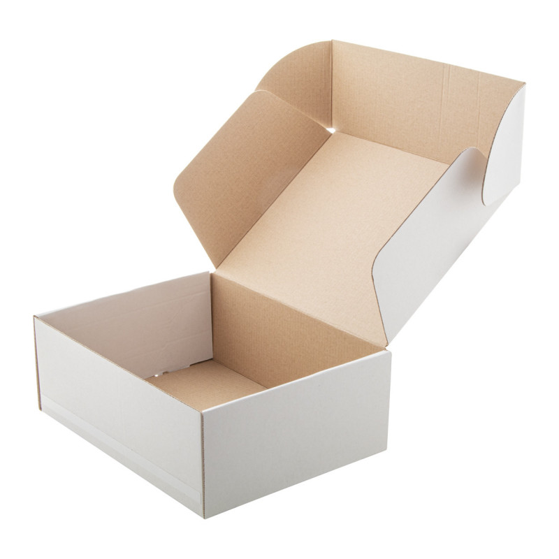 Egyedi gyártású, négyzet alapú, hullámkartonból készült önzáró ragasztócsíkkal ellátott postai ajándékdoboz.