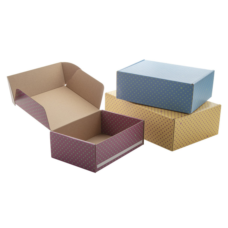 Egyedi gyártású, hullámkartonból készült önzárós postai ajándékdoboz.