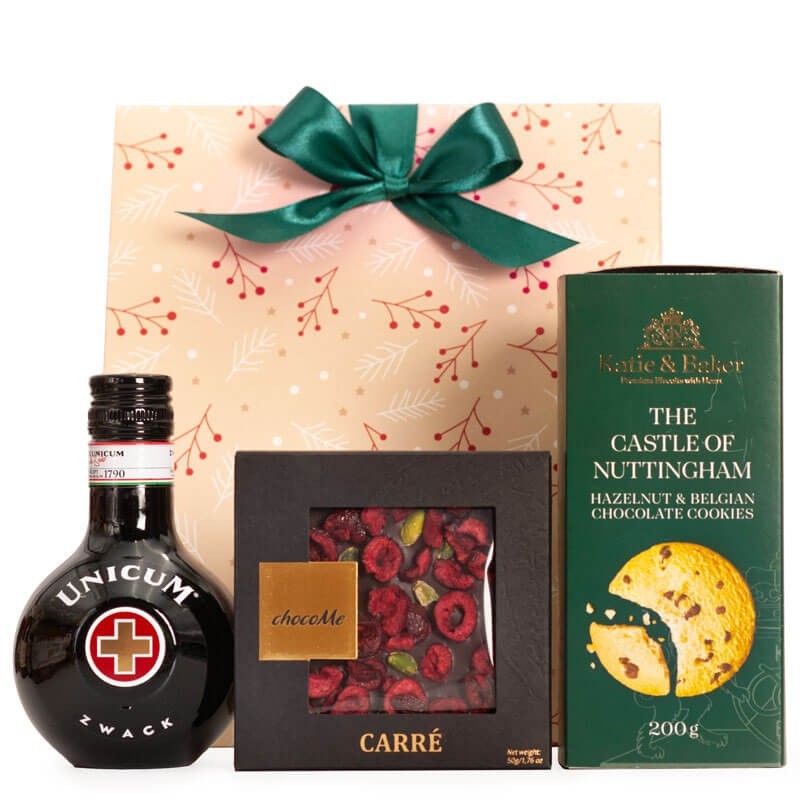 Céges ajándékcsomag Unicummal, csokival és egy kis sós ropogtatni valóval! Tökéletes választás az unicumot kedvelőknek, kibővített nagyobb változatban is elérhető ez a csomagunk!