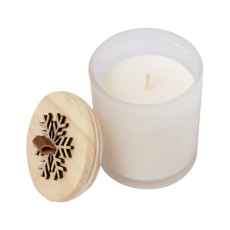 Növényi alapú illatosított viaszgyertya homokfúvott üveg tartóban, karácsonyi hópehely díszítéssel és bambusz fedéllel. 120 gramm viasszal. Kraft papír dobozban.