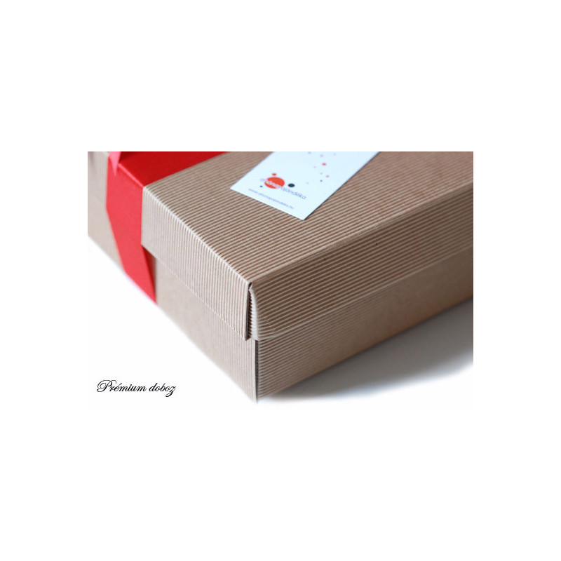 Csomagolás: Levehető tetejű prémium díszdoboz, kézzel készített szatén masnival.