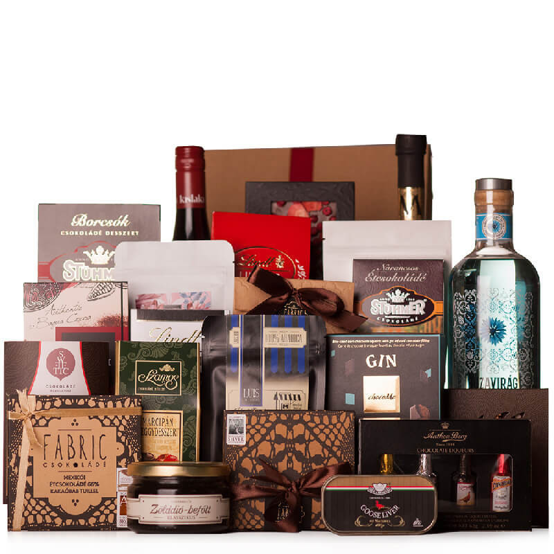 Gazdag ajándékcsomag gourmet finomságokkal. Cégeknek is ajánljuk több személy részére adható ajándékként.