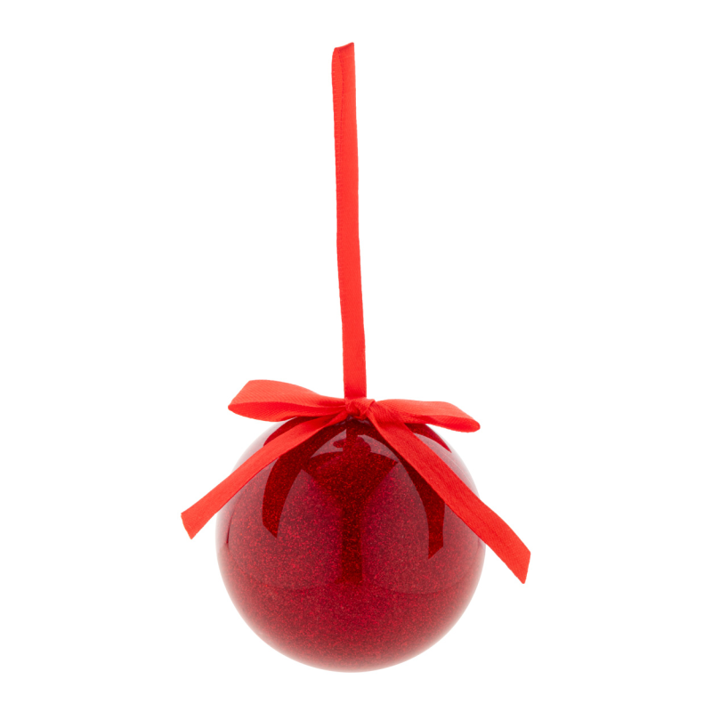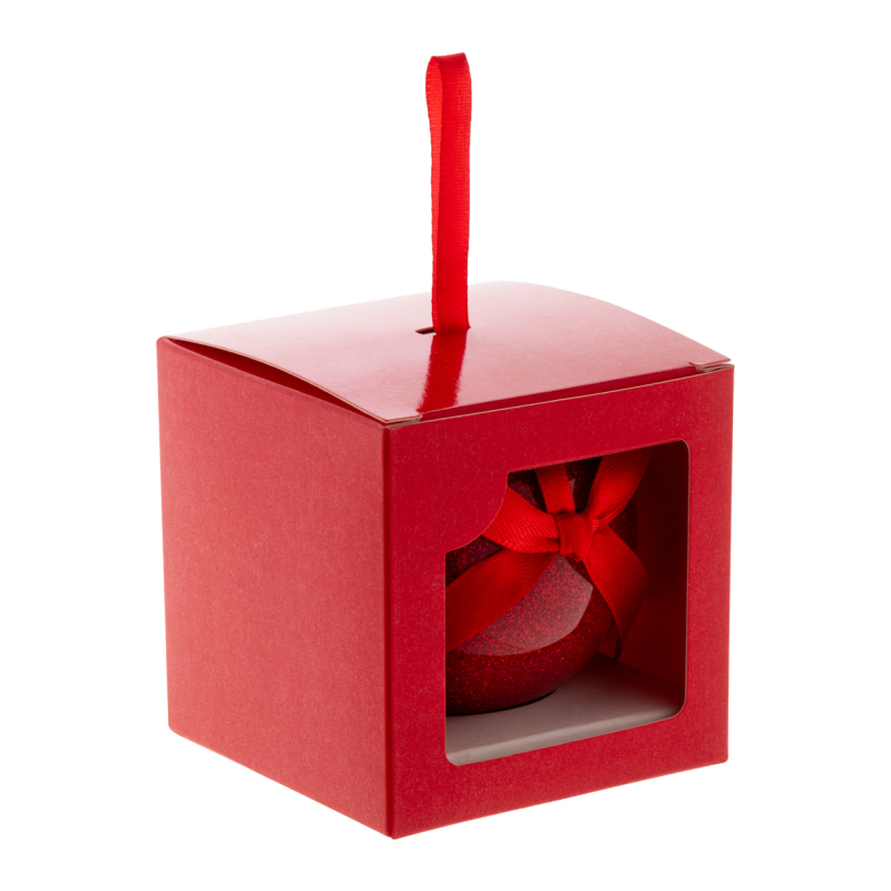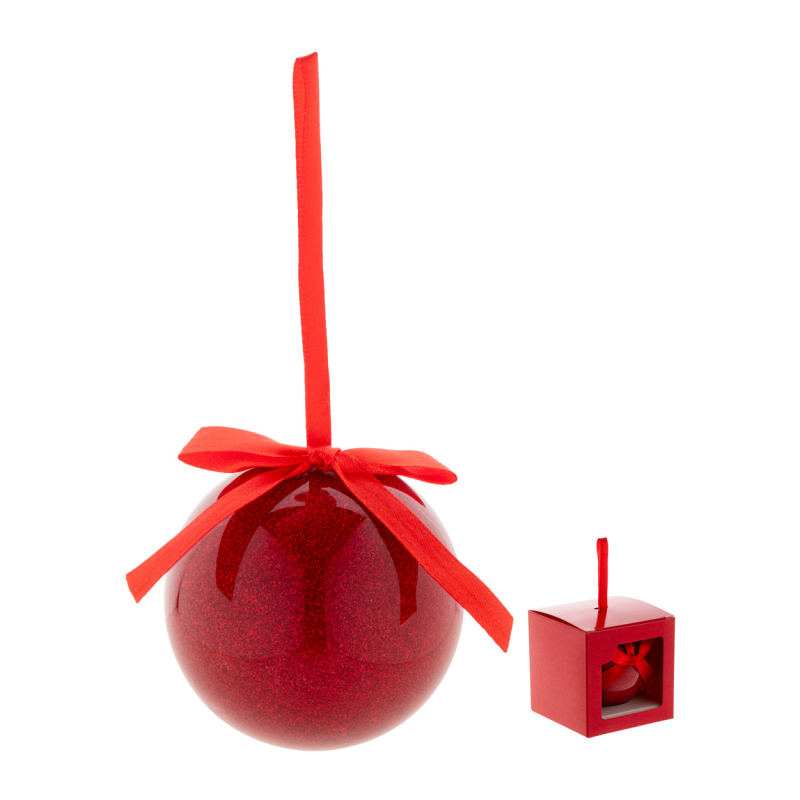 Csillogó, gömb alakú karácsonyfadísz PU habból, szalaggal. Gömb átmérője: 75 mm. Hozzáillő színű papír díszdobozban.