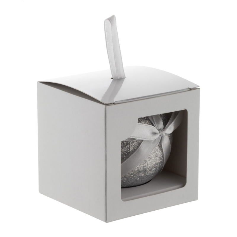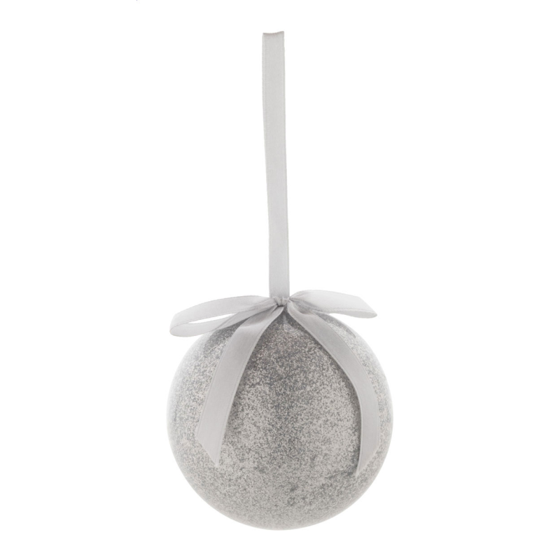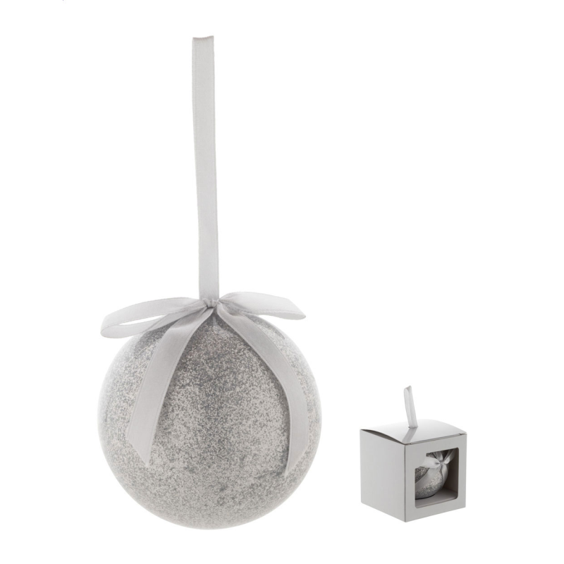 Csillogó, gömb alakú karácsonyfadísz PU habból, szalaggal. Gömb átmérője: 75 mm. Hozzáillő színű papír díszdobozban.