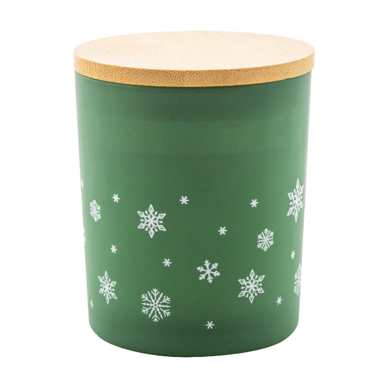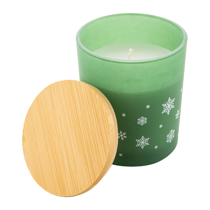Növényi alapú illatosított viaszgyertya homokfúvott üveg tartóban, karácsonyi hópehely díszítéssel és bambusz fedéllel. 120 gramm viasszal. Kraft papír dobozban.