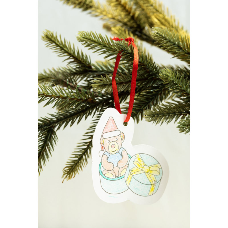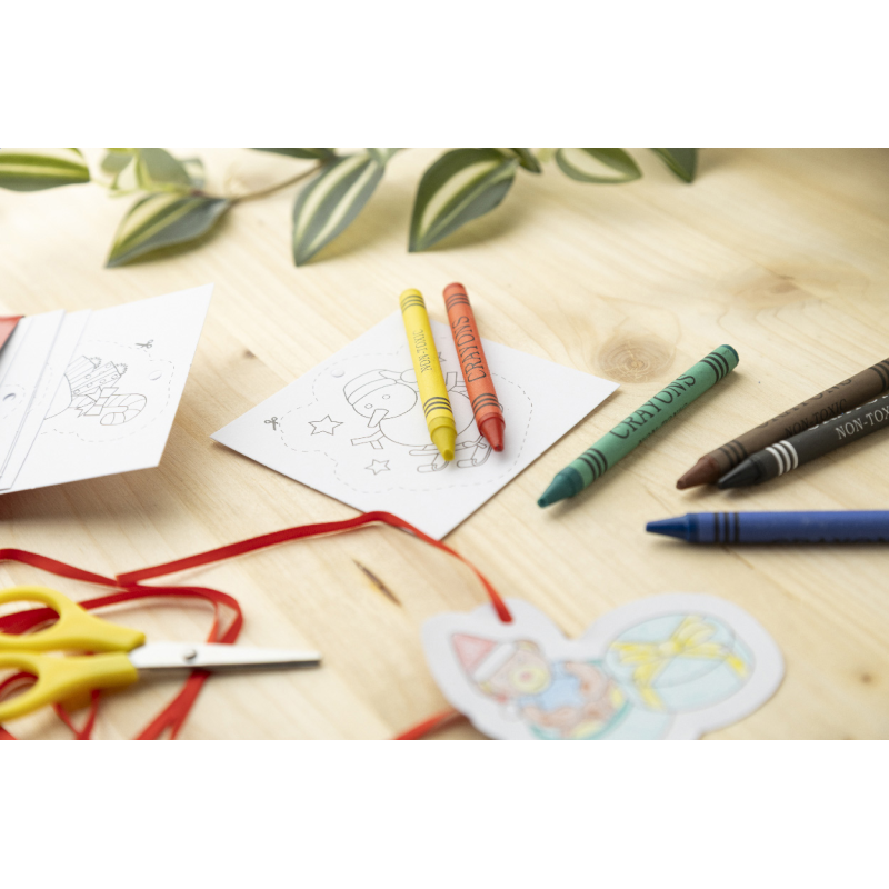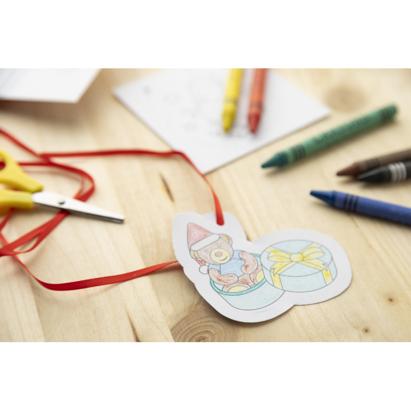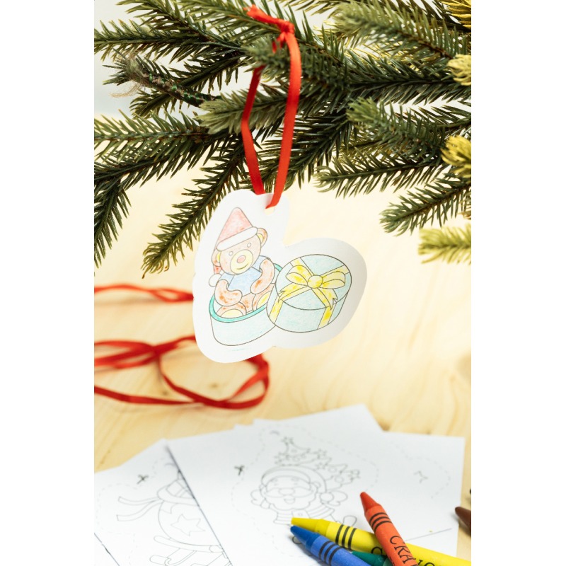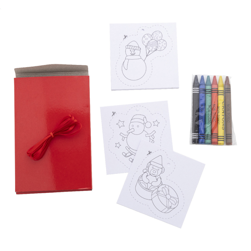 8 darabos karácsonyi színező szett papír karácsonyfadísz kártyákkal, 6 zsírkrétával és akasztós szalagokkal. Piros papírdobozban.