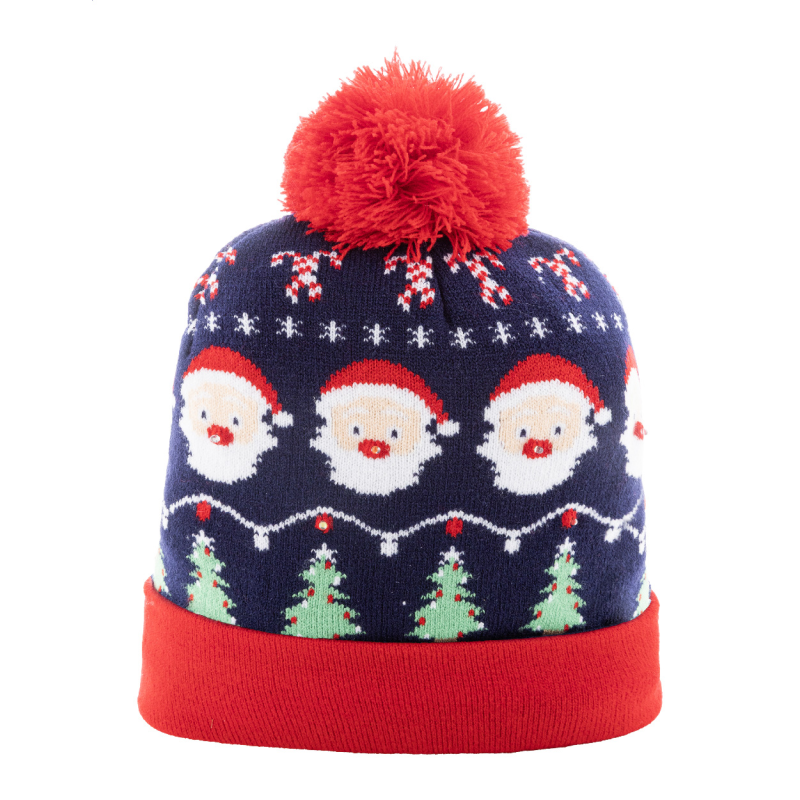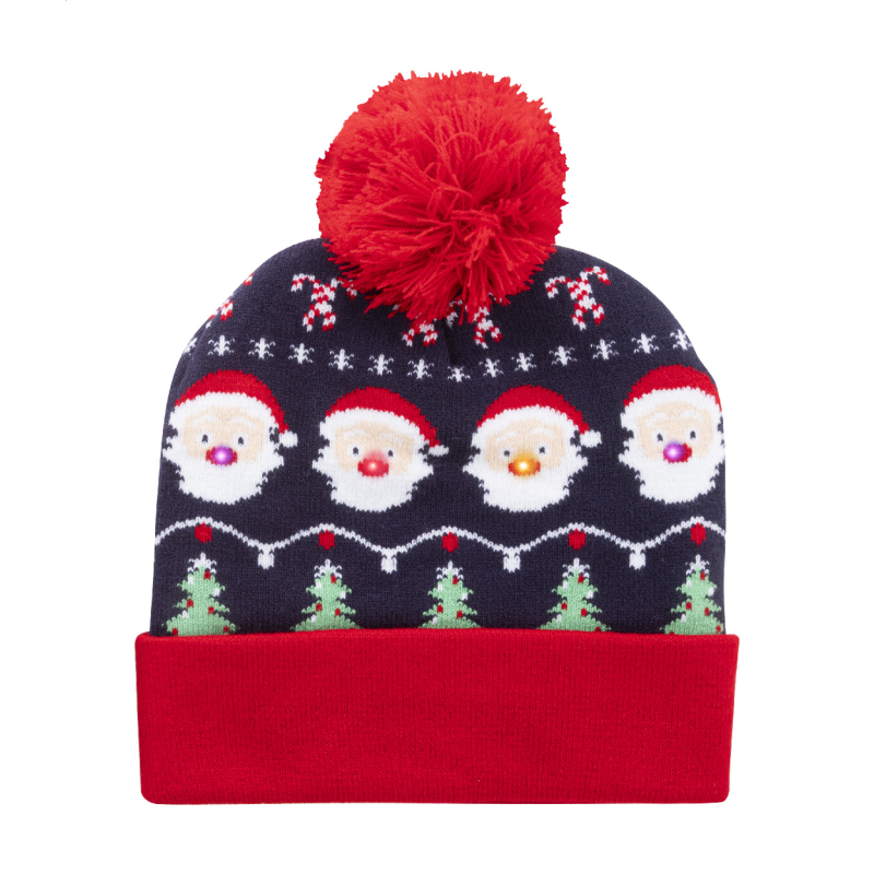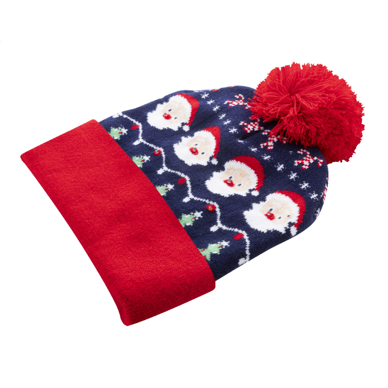 Kötött karácsonyi sapka akrilból, 6 LED fénnyel (3 világítási mód), mandzsettával és bojttal. Gombelemmel szállítjuk.