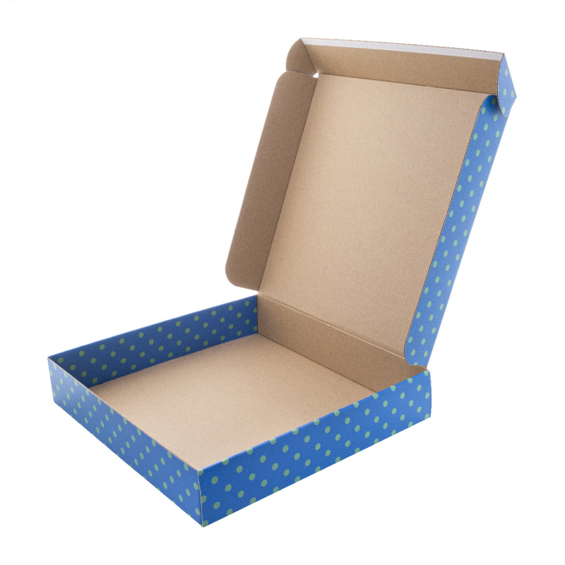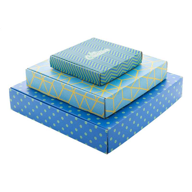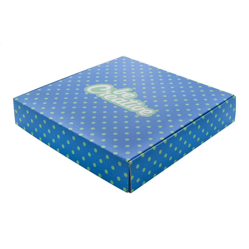 Egyedi gyártású, négyzet alapú, hullámkartonból készült önzáró ragasztócsíkkal ellátott postai ajándékdoboz.